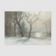 Winter in Yosemite by Albert Bierstadt, depicts the landscape with barren deciduous trees and snow-covered pine trees. The still frozen water reflects light on the whole scene creating a shimmering silver effect.