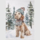 Watercolor painting of a cute Labradoodle dog sitting in the snow, wearing a cosy knit hat and plaid scarf with evergreen trees in the background.