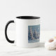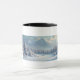 This winter landscape mug features a dark, cool aesthetic with an emphasis on deep blue tones. The background showcases majestic mountains, while in the foreground, snow-covered coniferous trees add to the scene. These elements beautifully capture the tranquillity and charm of winter, allowing you to enjoy the beauty of the season with every warm beverage. This mug offers a robust feel, making it the perfect item for a unique winter experience.