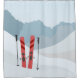 Abstract winter landscape with panoramic mountain view, red ski equipment, trail and blue sky