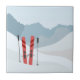 Abstract winter landscape with panoramic mountain view, red ski equipment, trail and blue sky