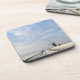 Plastic photo coaster with a minimalistic view on a winter landscape in Holland with a path and a canal towards a windmill under a layer of snow with nice clouds at sunrise in the dutch countryside.