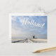 Photo postcard of a minimalistic view on a winter landscape in Holland with a path and a canal towards a windmill under a layer of snow with nice clouds at sunrise in the dutch countryside with the text 'Holland'.