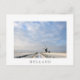 Photo postcard of a minimalistic view on a winter landscape in Holland with a path and a canal toward a windmill under a layer of snow with nice clouds at sunrise in the dutch countryside with a white border and the text 'Holland'.