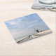 Paper photo coaster with a minimalistic view on a winter landscape in Holland with a path and a canal towards a windmill under a layer of snow with nice clouds at sunrise in the dutch countryside.