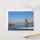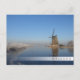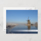 Postcard of a landscape in the countryside in the Netherlands in winter with a windmill, ice on the river and frosted reeds under a clear blue sky with a fading white bar and the text 'Holland'.