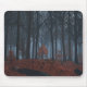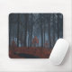 A stand of trees on an overcast winter day. The tall trees are bare and leafless, but the saplings underneath still have their brown leaves. The still-clinging and fallen leaves in shades of almost-pink provide a contrast to the dark trunks and foggy blue haze above.