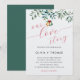 A winter wedding invitation template that features a painted watercolor theme of mistletoe and wedding bells. Classy and elegant, simple and modern, it is a lovely choice for a winter wedding, for a holidays wedding, a Christmas wedding. The title "our love story" is in modern calligraphy with simple, elegant flourishes.