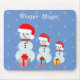 Winter magic snowmen with gifts and snowflake pattern on sky blue background Mouse Pad. Winter magic text can be personalised.