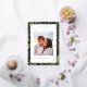 Share holiday greetings with these photo Christmas cards featuring your favourite photo set on a modern and minimal white background with a green botanical border trimmed with gold foil. An editable message area lets you customise your holiday greeting in modern lettering. Add your family name or names beneath.