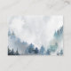 Rustic baby shower book request card featuring watercolor illustration of snowy mountain with pine tree forest and blue snowflakes. The card asks guests to bring in a new or used children's book instead of a card.