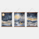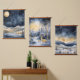 Decorate your house for the winter season with a beautiful set of three hanging panels each with a coordinating scene of a navy mountain background, stars, snow and wildlife.