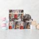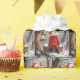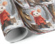 A cute mouse dressed in a warm red outfit sits on a tree stump surrounded by a snowy forest