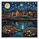 A.I. created interpretation of vibrant swirls and circular patterns dominate the night sky above a moonlit village nestled along a snowy landscape of bare, stylized trees while a reflective body of water echoes the sky's luminosity.