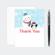 Winter wonderland "ONEderland" first birthday party thank you note card includes space on the bottom and back for a handwritten thank you message. Design features a happy snowman wearing a hat and scarf and a cute arctic penguin with Santa hat and number "1" on his tummy that is waving in the snow. The background has a pattern of snowflakes. Ice blue, turquoise, red, and white colours with black and grey accents.