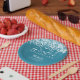 Cute winter snowflake theme kid's birthday party paper plate featuring typography text that says "Winter ONEDERLAND" with glowing snowflakes around. The background is blue. Great for a boy's party during the Christmas time.
