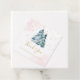 Soft pastel pink and gold winter birthday favour tags featuring a watercolor pine tree forest and snowflakes. With elegant handwritten calligraphy.