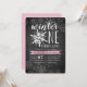 Brrr! Frosty chic invitations for winter wonderland theme first birthday celebrations feature a white snowflake border on a rustic chalkboard background with frosty pink watercolor accents. "Winter one-derland" appears at the top in chic white lettering, with a snowflake standing in for the letter "O." Personalise with your first birthday party details beneath using the template fields.