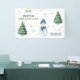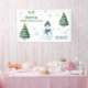 Watercolor kids birthday. Watercolor snowman, snowflakes, evergreen pine trees, green bow.