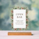 Winter Open Bar Acrylic Sign. Guide your guests to the bar with our open bar tabletop acrylic sign, part of the "Elegant Winter Pinecone Greenery Wedding Suite." This sign combines modern elegance with the hand-painted beauty of greenery and pine boughs, ensuring a cohesive and inviting atmosphere for your celebration.