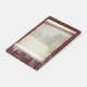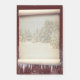 Winter parchment illustration featuring old paper scroll with a snowy landscape and decorated with snow and icicles on a dark red background with snowflakes.