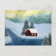Dawn K. Williams's painting of a wintry landscape, "Winter Peace," has a barn-red cabin with a snowy roof in a forest setting. A frozen, deep blue river runs beside the cabin, and the tree-dotted landscape is covered in a blanket of snow. A yellow sunrise (or sunset) gives a warm glow to the scene. Perfect for Christmas or any wintertime holiday, or all season long.