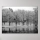 Snow covered trees by pond winter scene