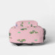 Ski opening! Cool winter-themed skier pattern design with skiers skiing down alpine ski resort slopes among snow-covered fir trees in the Alps. Freeride skiers are wearing colourful vintage retro ski suits, skiing downhill with skis on a pastel pink snowy mountain landscape background.