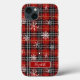 Winter red and black plaid with snow and snowflakes cell phone case personalised with a name in an editable chic handwritten script font style. ASSISTANCE: For help with design modification or personalisation, colour change, resizing, transferring the design to another product or if you would like coordinating items, contact the designer BEFORE ORDERING via the Zazzle Chat MESSAGE tab below or email makeitaboutyoustore@gmail.com.