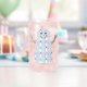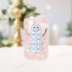Four squares in pale blues and purples are decorated with snowmen wearing top hats and winter clothing, like toboggans, scarves, and mittens. White stitching adds a decorative touch, giving the repeating pattern the appearance of a quilt, creating a perfectly cosy feeling for winter. The shape of a snowman creates a mask for the design to add a final seasonal touch. This glassware is also available in stemless wine glass and rocks styles.