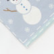 Four squares in pale blues and purples are decorated with snowmen wearing top hats and winter clothing, like toboggans, scarves, and mittens. White stitching adds a decorative touch, giving the repeating pattern the appearance of a quilt, creating a perfectly cosy feeling for winter.