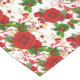 This beautiful table runner is appropriate for the entire winter season, not just for Christmas! It features a pattern of bright red roses paired together with green holly and red berries. Also included in the pattern are gold and red swirl embellishments and subtle gold confetti. Everything is placed on a white background. Elegant!