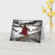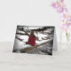 This friendship card features a thoughtful young woman in a red jacket sitting on a fallen log at a partially frozen creek reflecting on the snowy, cold winter scene. The text reads: Just thinking of you... It can be customised to suit your needs.