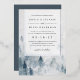 Elegant winter wedding invitation features a watercolor background depicting a snowy mountain landscape dotted with pine trees in misty shades of blue and grey. Personalise with your wedding details in chic soft off-black lettering, accented with silver foil trim. A beautiful choice for elegant winter weddings in mountain or forest settings.