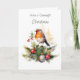 Celebrate the festive season with this winter scene: watercolor illustration of red- breasted robin perched on a branch of pine.