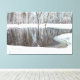 The image shows a winter landscape with a body of water reflecting the surrounding snow-covered trees. The trees are bare and covered in snow, and the ground is also covered in a thick layer of snow. The water is calm and reflects the trees and sky, creating a mirror-like effect. The foreground features snow-covered banks and partially frozen water.