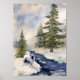 Beautiful watercolor image of a Keeshond in a snowy forest.
