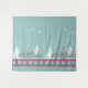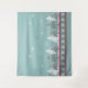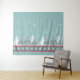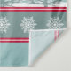 Winter scene illustration with pine trees and snowflakes decoration on blue, red and white striped background