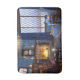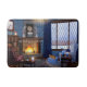 A cosy reading corner on a snowy winter day, with a ginger cat sitting gazing at the blazing fire. Around the hearth are cushy armchairs, with glowing candles and stacks of books and a steaming mug to complete the comfort. Outside a frost-covered willow and beech hedge are obscured by the falling snow.