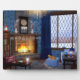 A cosy reading corner on a snowy winter day, with a ginger cat sitting gazing at the blazing fire. Around the hearth are cushy armchairs, with glowing candles and stacks of books and a steaming mug to complete the comfort. Outside a frost-covered willow and beech hedge are obscured by the falling snow.