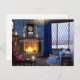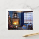 A cosy reading corner on a snowy winter day, with a ginger cat sitting gazing at the blazing fire. Around the hearth are cushy armchairs, with glowing candles and stacks of books and a steaming mug to complete the comfort. Outside a frost-covered willow and beech hedge are obscured by the falling snow.