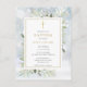 Featuring delicate watercolor greenery leaves on a winter frost background and an elegant gold crucifix, this chic gender neutral baptism or christening invitation can be personalised with your special information, with a silver sage background on the reverse. Designed by Thisisnotme©