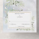 All in one wedding invitation featuring elegant botanical watercolor greenery leaves and a chic gold frame border on a winter snowflakes background. The invitation includes a perforated RSVP card that can be individually addressed or left blank for you to handwrite your guest's address details. Designed by Thisisnotme©