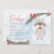 Baby, It's cold outside! Modern Christmas winter illustration with red flowers, green pine tree branches, mistletoe and snow featuring a Christmas glass ball ornament with a gender neutral baby clothing and modern script baby shower with a modern calligraphy typography with flowers on winter ice blue background.