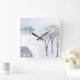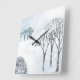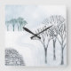 A snowy winter landscape scene with trees and a dry stone wall. Brrr! Original art by Nic Squirrell.