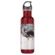 This original Christmas image is a painting of a very cute little black and tan mixed breed dog, he’s sniffing and scratching at the thick layer of freshly fallen snow that he’s just discovered for the first time in the garden. This little dog is named Eddie, he’s a german shepherd cross breed dog and he’s enjoy the cold weather in his winter garden. In the background of this festive picture you can see a little grey garden gnome quietly sitting and reading his book at the side of the small snow covered frozen pond. There’s also lots of snow covered garden shrubs and an old wooden shed in Eddie’s garden, all these bits and bobs add interest to this great festive red Christmas snow scene water bottle.