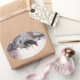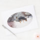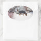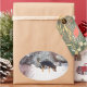 This original Christmas image is a painting of a very cute little black and tan mixed breed dog, he’s sniffing and scratching at the thick layer of freshly fallen snow that he’s just discovered for the first time in the garden. This little dog is named Eddie, he’s a german shepherd cross breed dog and he’s enjoy the cold weather in his winter garden. In the background of this festive picture you can see a little grey garden gnome quietly sitting and reading his book at the side of the small snow covered frozen pond. There’s also lots of snow covered garden shrubs and an old wooden shed in Eddie’s garden, all these add interest to this lovely festive Christmas snow scene sticker.