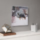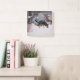 This original Christmas image is a painting of a very cute little black and tan mixed breed dog, he’s sniffing and scratching at the thick layer of freshly fallen snow that he’s just discovered for the first time in the garden. This little dog is named Eddie, he’s a german shepherd cross breed dog and he’s enjoy the cold weather in his winter garden. In the background of this festive picture you can see a little gray garden gnome quietly sitting and reading his book at the side of the small snow covered frozen pond. There’s also lots of snow covered garden shrubs and an old wooden shed in Eddie’s garden, all these details add interest to this lovely seasonal snow scene clock.