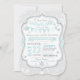 Grey snowflake print background with silver glitter trim and powder blue and white polka-dot band with lace-look trim edging. Patchwork bunting banner and silver snowflakes winter season twin boys baby shower invitation card design.