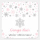 Cute winter-themed first birthday / baby shower favour sticker featuring pink and silver snowflakes, faux glitter stars and confetti sprinkles